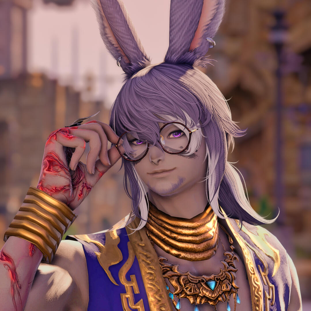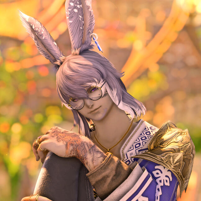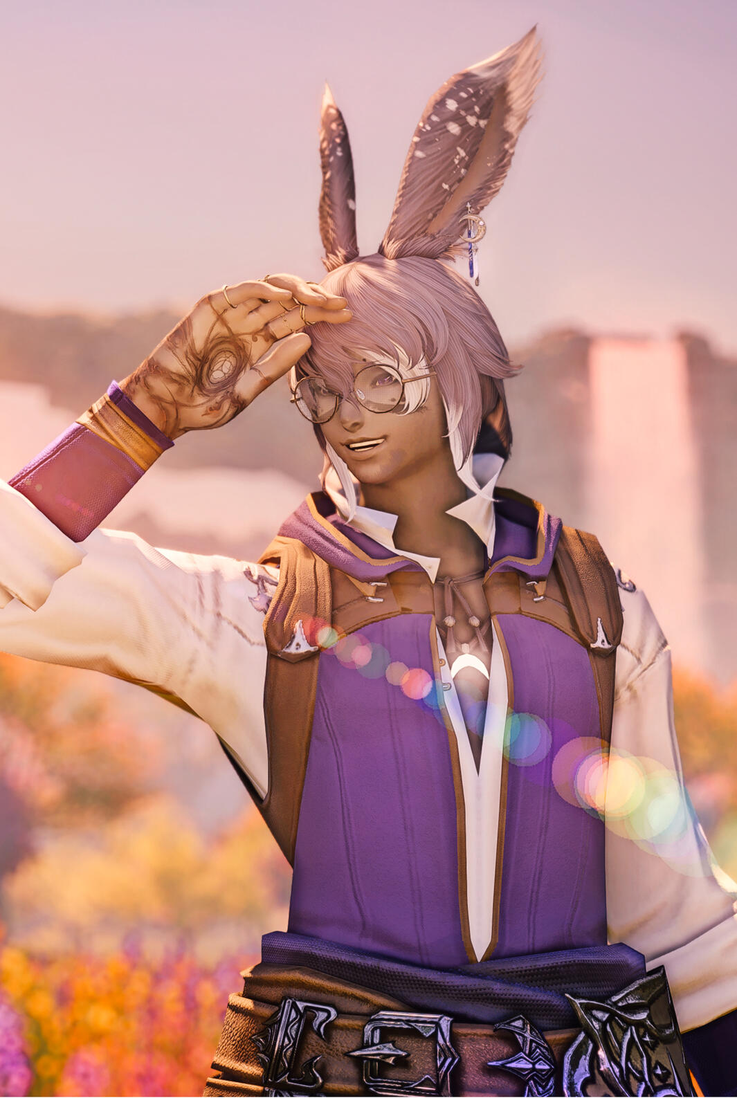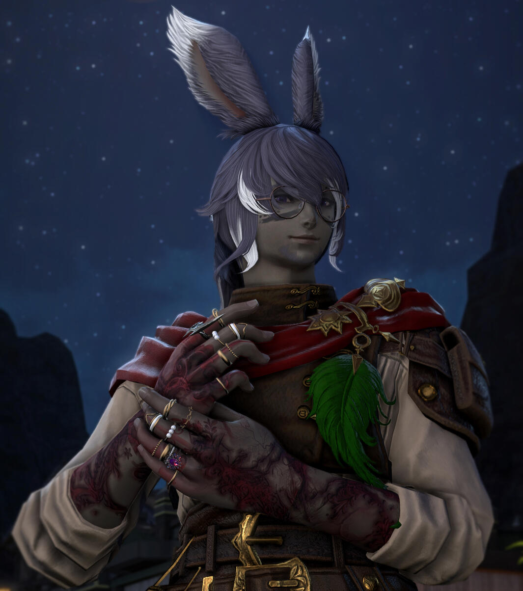 Kel was born to viera of the Golmore Jungle, whose uniquely coloured skin and hair marks him as a member of a special group of moon-worshipping viera, unique even amongst their peers. Many of his overall features match his birth father's, including his darker gray-toned skin and gray hair with white hightlight, but his face is more familiar to that of his birth mother, including his soft nose and gentle smile.Kel's eyes were once a deeper purple; however, after Kel's rebirth at the horizon of magic, much of his body and was changed including his eyes which have now taken on a richer indigo colour. Additionally, his eyes have an internal shine to them and his pupils have morphed into a star shape.Another change during his rebirth are the markings along his arms - when teleported away from the final fight in Endwalker, in which he expired, Kel spent either a moment or infinity floating in a space he believes to the horizon of magic. While floating in infinite space, an unimaginable amount of aether flowed through his body, marking his arms with imagery of feathers, vines, and thorns and bringing him back to life. While exploring his markings, which subtly glow with a warmth from inside, he found the aether channels that flow through his body had grown substantially, meaning he can wield stronger magics than he ever imagined.Beyond his magic prowess, however, Kel maintains his body as a result of being a practiced red mage. He remains dexterous and fit, with stronger arms and hands that beget training and practice as both a duelist and a baker. He remains toned, lean, and strong even when not with the Scions or adventuring.Finally, his legs; Kel was at the Battle of Carteneau as part of the Immortal Flames. Unfortunately, on Garlemald's side was a man with a visceral hatred for him, and as such used a lightning 'magic' that chained to and killed not only much of his own allies as well as Kel's, but scarred Kel's legs with lightning that continues to eat at his legs to this day, rendering him without feeling in his feet and much of legs, requiring daily healing, ointments, and massaging.