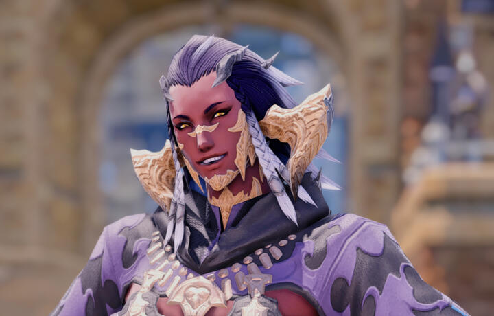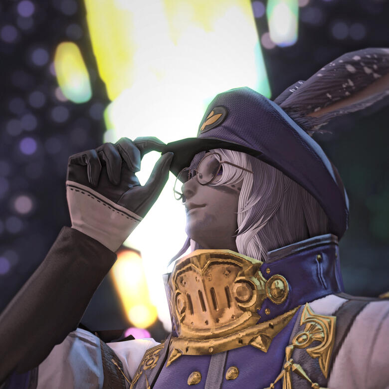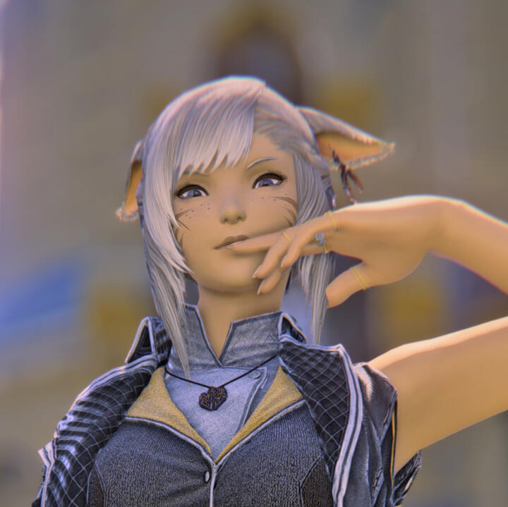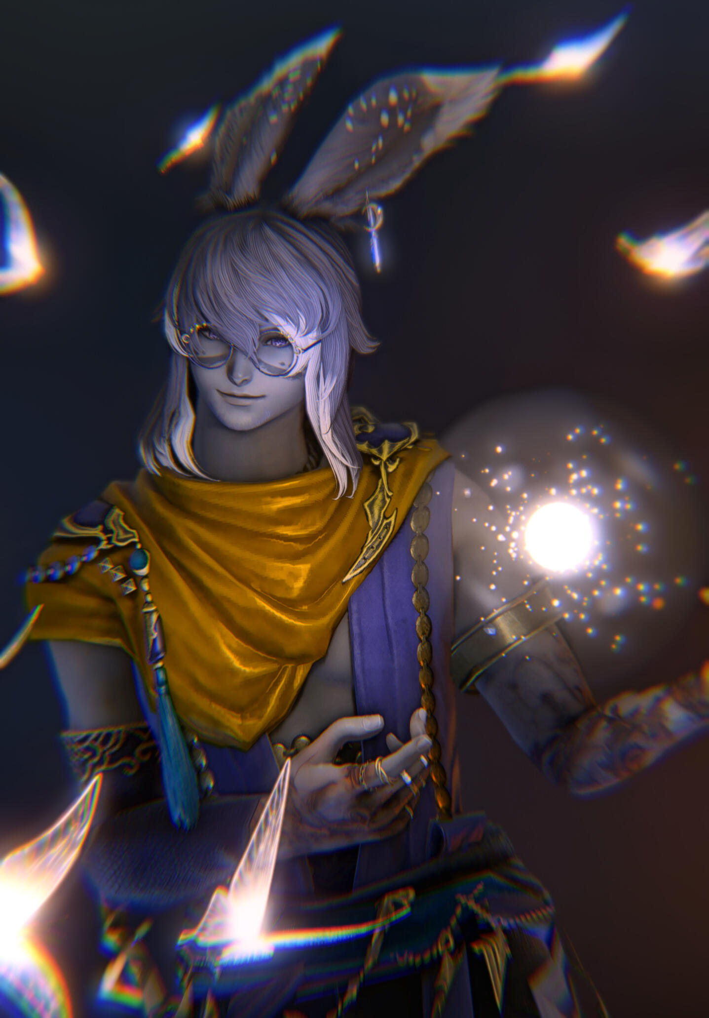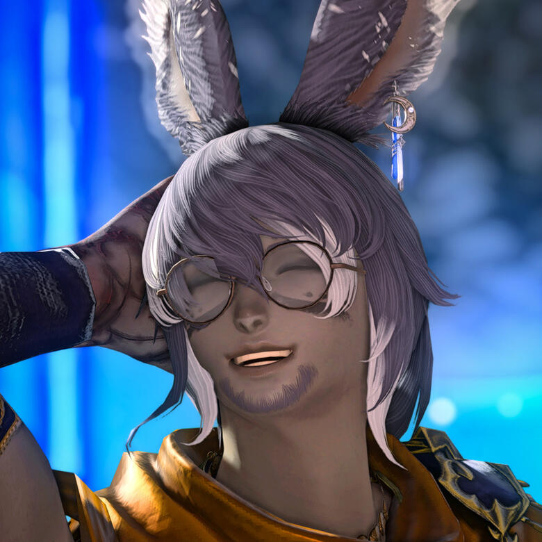 Kel was born to viera of the Golmore Jungle, whose uniquely coloured skin and hair marks him as a member of a special group of moon-worshipping viera, unique even amongst their peers. Many of his overall features match his birth father's, including his darker gray-toned skin and gray hair with white hightlight, but his face is more familiar to that of his birth mother, including his soft nose and gentle smile.Kel's eyes were once a deeper purple; however, after Kel's rebirth at the horizon of magic, much of his body and was changed including his eyes which have now taken on a richer indigo colour. Additionally, his eyes have an internal shine to them and his pupils have morphed into a star shape.Another change during his rebirth are the markings along his arms - when teleported away from the final fight in Endwalker, in which he expired, Kel spent either a moment or infinity floating in a space he believes to the horizon of magic. While floating in infinite space, an unimaginable amount of aether flowed through his body, marking his arms with imagery of feathers, vines, and thorns and bringing him back to life. While exploring his markings, which subtly glow with a warmth from inside, he found the aether channels that flow through his body had grown substantially, meaning he can wield stronger magics than he ever imagined.Beyond his magic prowess, however, Kel maintains his body as a result of being a practiced red mage. He remains dexterous and fit, with stronger arms and hands that beget training and practice as both a duelist and a baker. He remains toned, lean, and strong even when not with the Scions or adventuring.Finally, his legs; Kel was at the Battle of Carteneau as part of the Immortal Flames. Unfortunately, on Garlemald's side was a man with a visceral hatred for him, and as such used a lightning 'magic' that chained to and killed not only much of his own allies as well as Kel's, but scarred Kel's legs with lightning that continues to eat at his legs to this day, rendering him without feeling in his feet and much of legs, requiring daily healing, ointments, and massaging.